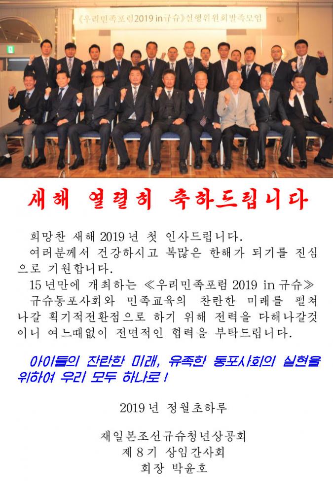 2019年1月1日 新年のご挨拶 明けましておめでとうございます。 激動の2018年から更なる進展と飛躍が期待される2019年へ 何より、《ウリ民族フォーラム2019 in九州》を機に九州 在日朝鮮人運動を新たな段階へと導いていく2019年がいよいよ始まりました。 本年も何卒宜しくお願い申し上げます。